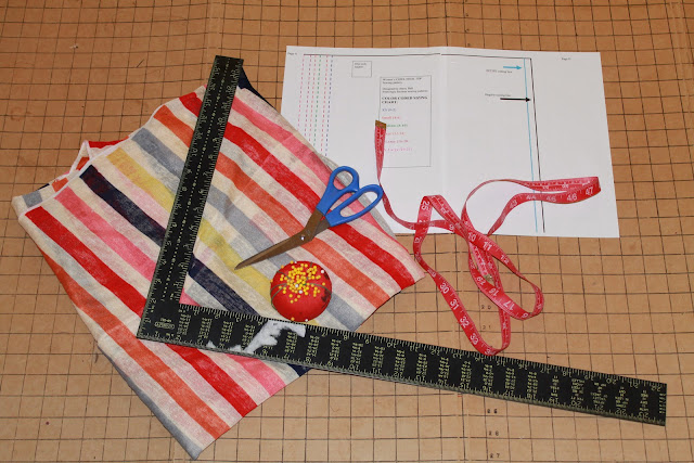 1. Gather materials: 1 yard of knit fabric, ballpoint needle, straight edge, scissors, pins, measuring tape and a t-shirt you own to trace the neck and sleeves.