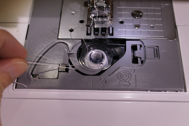 **Below: When you turn it around you may see this elastic thread piece under your fabric. Pull it. It sometimes gets stuck in your first few stitches. Just pull until it releases. You aren't messing up any of the stitches, you are just moving it out of the way so it doesn't get sewn over when you turn your fabric around.