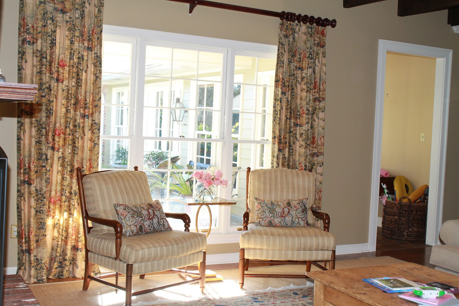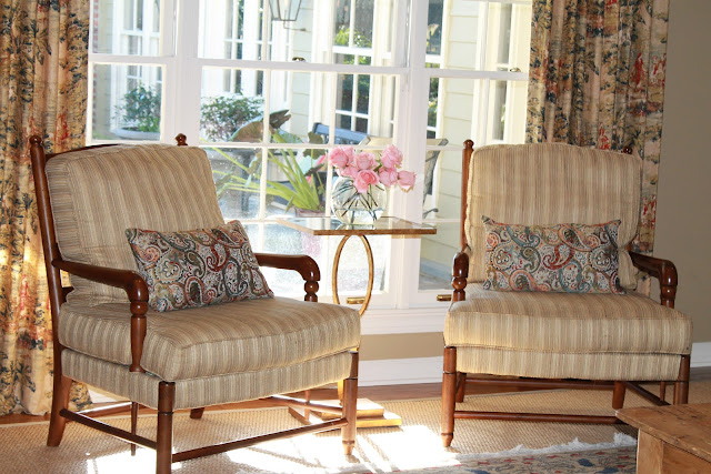 I took these flowers off the kitchen counter this morning and put them on this side table. I love the softness it adds to the room, so I think they will stay.