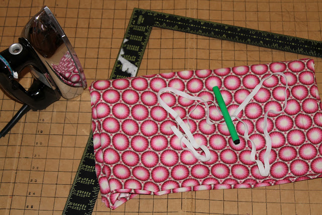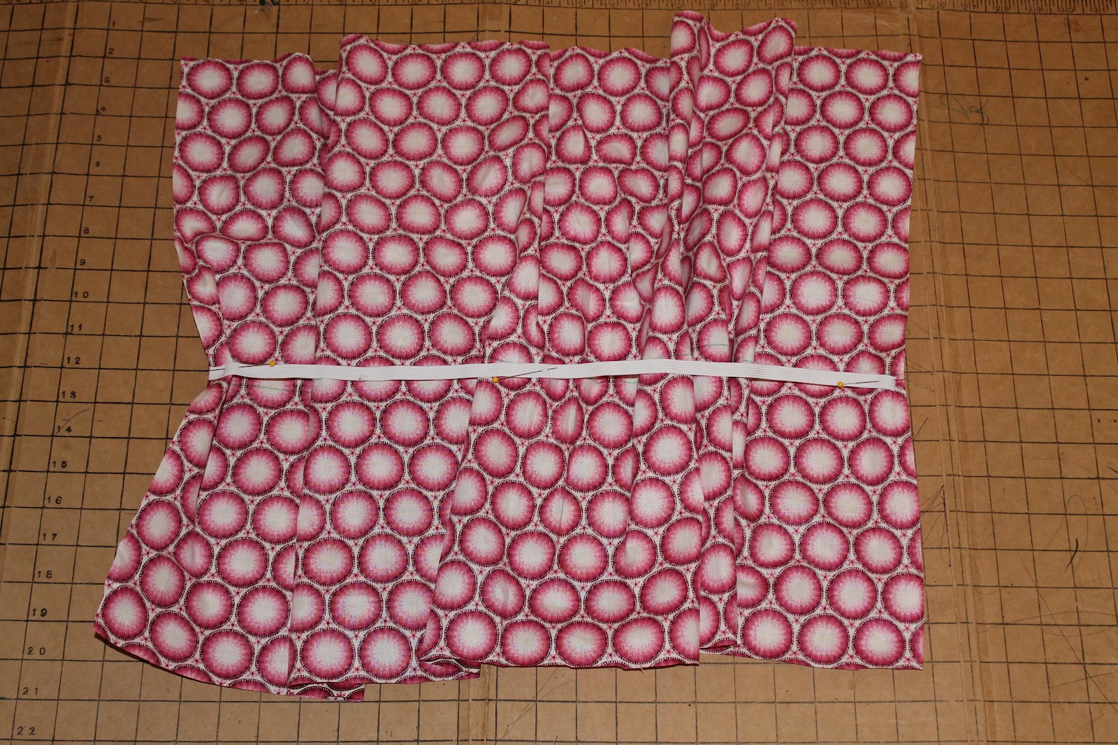 1. Gather materials: fabric, straight edge, iron, 3/8 inch elastic, fabric marker, pins, sewing machine, scissors and thread2. Cut a piece of fabric 19 inches long x 36 inches wide