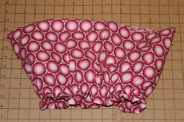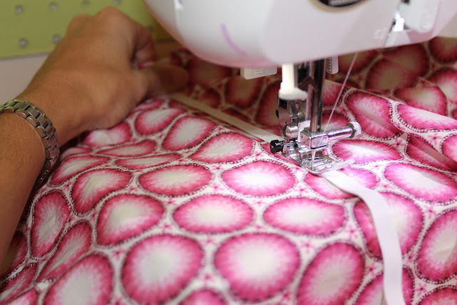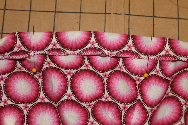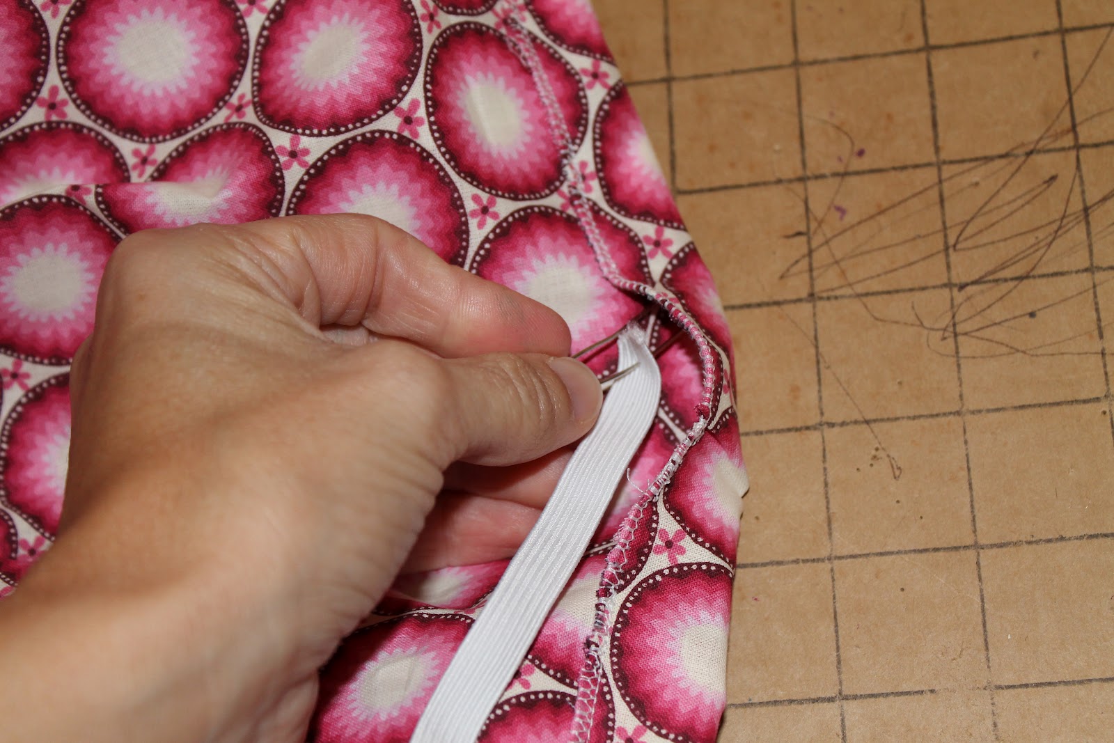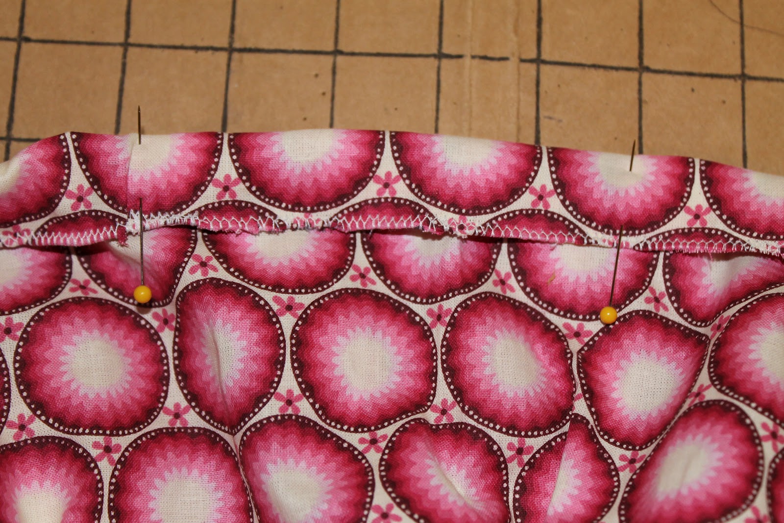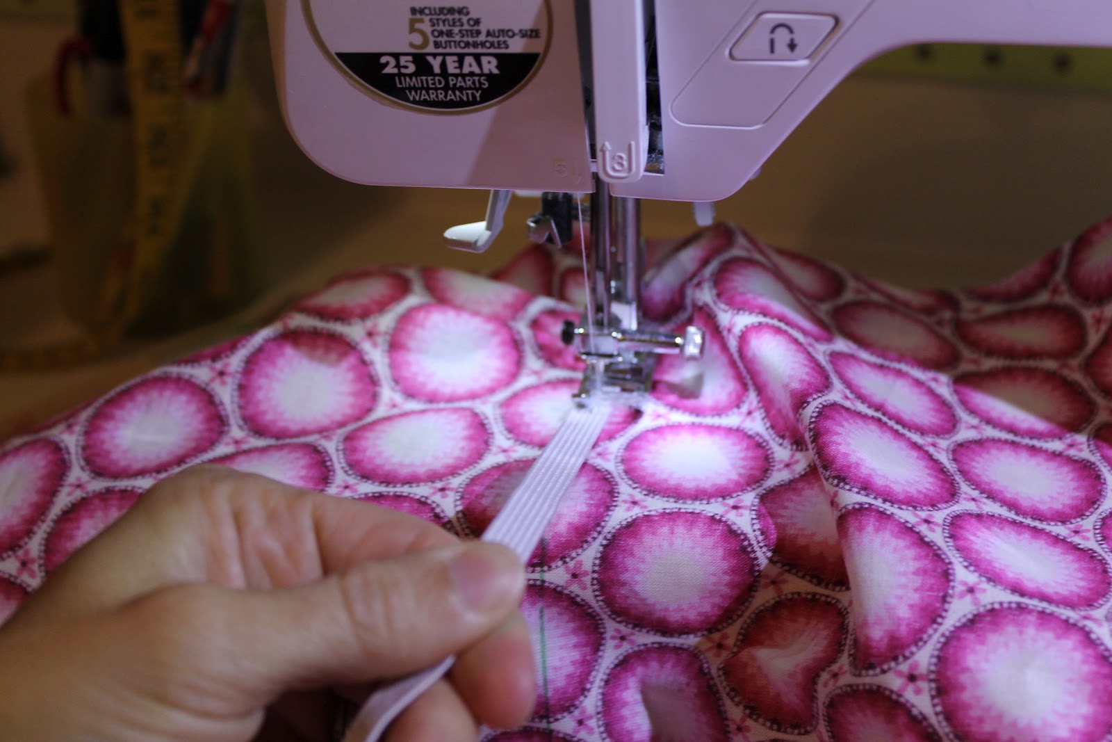 7. Sew your elastic down along the drawn line. Pull to extend the elastic as you sew. This is what gathers the fabric. You will pull it pretty firmly, so the fabric between two pins fits along that length.