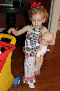 8. Make 2 straps 26 inches long each and attach! (I put a buttonhole front-center to put the straps through to tie; but this can also be worn backwards and have it tie in the back.)