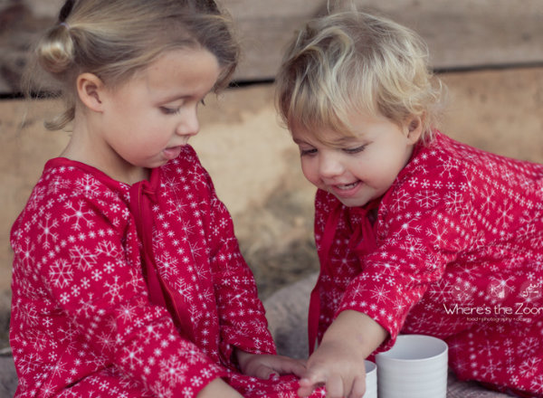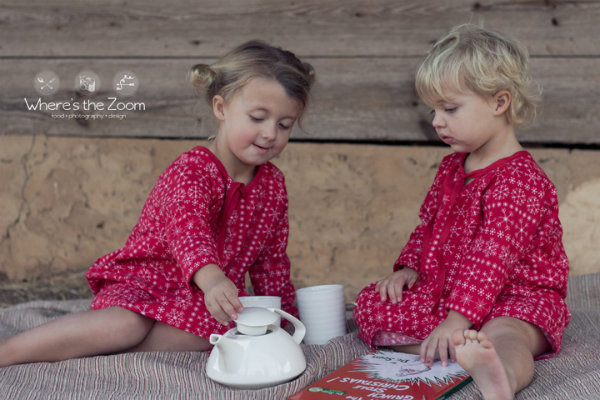 They look ready for Christmas already wearing their holiday pajamas and enjoying a tea party together, serving one another a cup of imaginary hot cocoa.