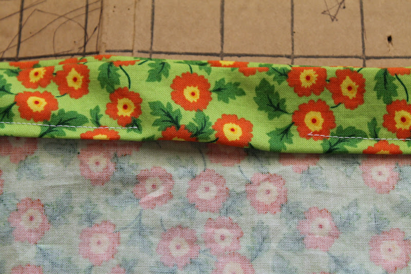 3. Lay it right side down. Fold up a 1 inch hem along the bottom, press with an iron, then fold up another 1 inch hem and press with an iron. Pin.