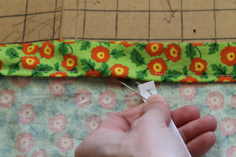 9. Insert a safety pin onto the end of your elastic strip for the waist. Feed the pin through the elastic casing you just sewed until the other side of the elastic comes out the open end. Hold both ends together and pin. (Make sure the whole strip of elastic does not end up in the casing. If it does, it's an easy fix...you will just pull it out and start over.)