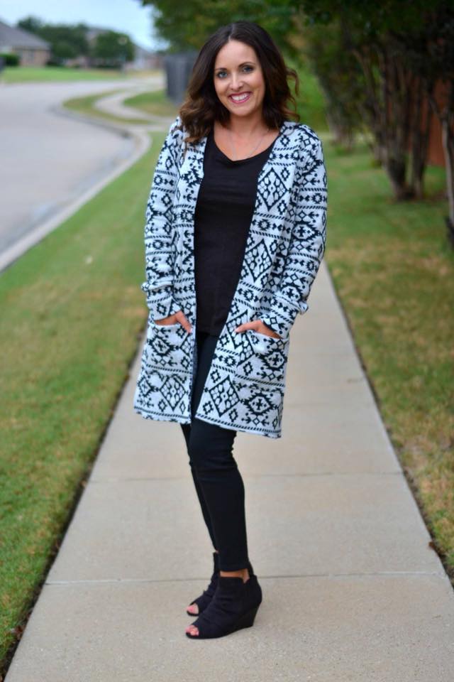 The second one is made from a jersey knit fabric that does not have as much stretch as the blue cardigan above. It is the perfect cardigan weight to keep you warm, but not too warm during those fall months!