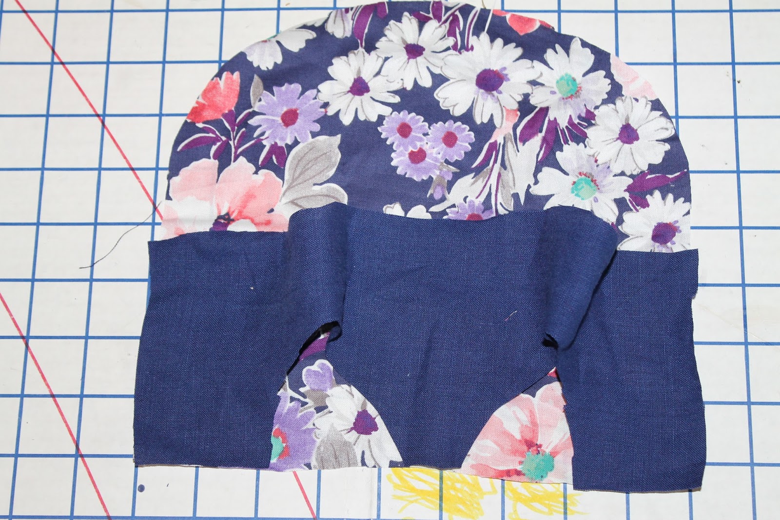 7. Lay one carrier piece right side up. Lay the stuffed animal holder right side up and centered along the bottom edge. Gather it and pin. You need this to be roomy because of the depth of the stuffed animal - they are not flat like a piece of paper :)