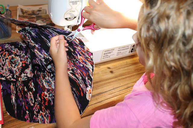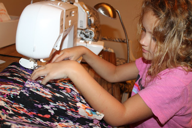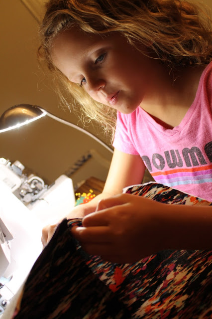 Catherine is almost 8 years old and has been "sewing" with me the past few years. She usually sits on my lap and I let her lift the presser foot, push the backstitch button and turn the hand wheel to lift the needle, then trim the threads. Well, this time it was different! My big girl sat at the machine all by herself and I stood next to her, in awe of her moving the fabric as she sewed, knowing exactly when to lift and lower the presser foot and watching her little hands trim the thread. Just in awe. It was a beautiful and proud moment and I love watching her grow up!