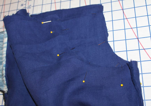 3. Lay front and back shorts pieces right sides together. Pin down the top edge until you reach the pocket, then pin around the entire pocket, then pin down all the way to the bottom edge of the shorts. Next, line up the inseams and pin.