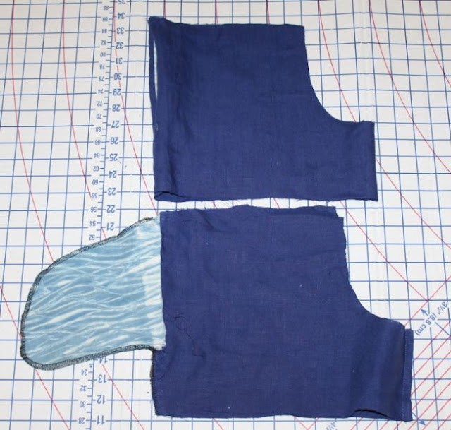 5. Take the right side out piece and stick it into the piece that is wrong side out. Line up the crotch seam (it will form a U shape) and pin.