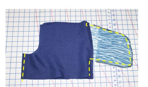 1. Lay front and back pieces right side up. Lay pocket pieces right side down and pin down pocket. Sew along the pocket edge using a 1/8 inch seam allowance. Repeat for other front and back, making sure they are also laid right side up.