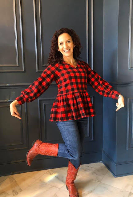 Come learn how to sew a bishop sleeve top for women with our Addie Top sewing pattern for women! This new bishop sleeve top can be made out of your favorite woven fabrics and can be made into a top or a dress. Ya'll I have already made two of them and I cannot stop wearing my red buffalo plaid fabric one! And, lucky for me, they match with my red cowboy boots! I got these boots about 9 years ago in Austin, TX and look forward to wearing them all fall and winter long!! Except, I live in Louisiana where it only gets cool here a few months if we're lucky....so I live in them during that time! I call it RED BOOT SEASON and I do a little happy dance when I walk out into the kitchen each morning! Not kidding. My kids will tell you! So, if you have red boots or your favorite pair of fall/winter shoes....go flaunt them! Come summer you wish you would be able to wear them!