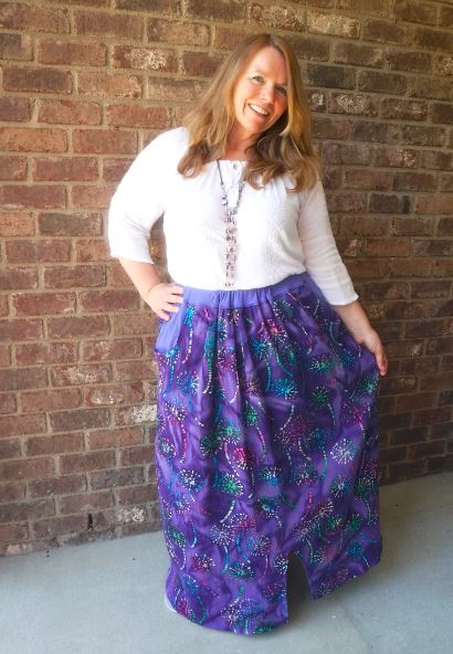 The Orleans Avenue Maxi Skirt can be made in your favorite woven or knit! If you are using knit there are directions to reduce the width by trimming on the fold for the skirt and waistband.