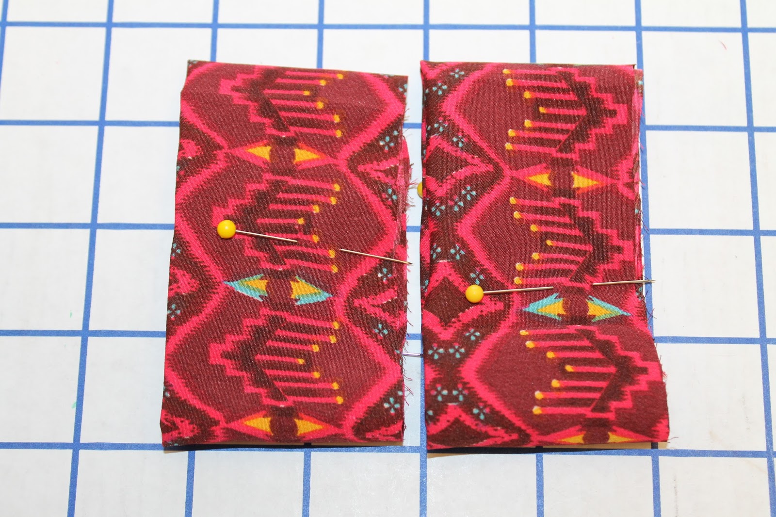 Sew your cuff into a loop and fold in half: Lay each cuff right sides together so the 4 inch edges meet, pin and sew using a ¼ inch seam allowance. Press seams open. Now make the long, raw edges meet wrong sides together and press with an iron so you have two cuffs that are 2 inch wide each. **TRY IT ON - Slip it onto your wrist to make sure it fits! If not, make another one, adding width - leave the 4 inch length but widen it as needed.