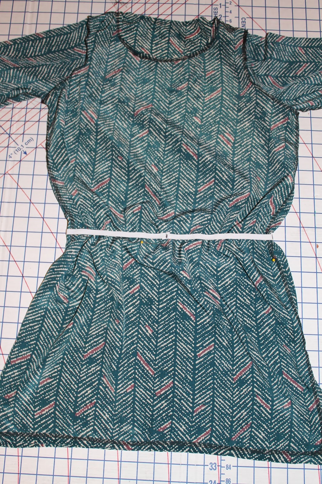 the dress/ the wrong side of the dress fabric. Sew on the elastic using a zig zag stich and stretching the elastic gently as you go, making sure the dots meet up as you sew. Trim threads. *You need to stretch the elastic so it will gather the fabric back up when you let go of it.